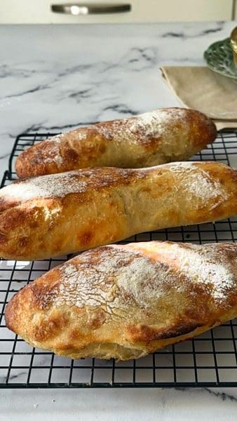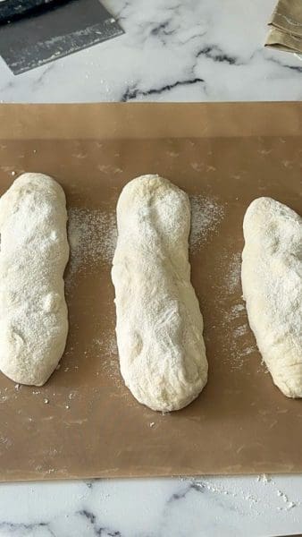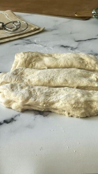 - מבצעים 2 קיפולים עם החמאה: מותחים מעט את הבצק למלבן גדול ומניחים במרכז מחצית מהחמאה. מקפלים ל3 ( מעטפה) כך שיוצר מלבן קטן שעוטף לגמרי את החמאה המגוררת ( צפו בסרטון). מכסים וממתינים חצי שעה. מותחים בעדינות את הבצק למלבן גדול יותר ומניחים חמאה קפואה במרכז וחוזרים על הקיפול. מקמחים גם מלמעלה. מכסים ומשהים ל10 דקות. מותכים ממש מעט את הבצק ומחלקים / חותכים ל 3 ג׳בטות אחידות לאורך הבצק. צובטים מעט את הבצק בצדדים במידה והחמאה בולטת. מעבירים לתבנית עם נייר אפייה. מכסים מתפיחים כשעה או עד שהלחמים כמעט מכפילים את נפחם.