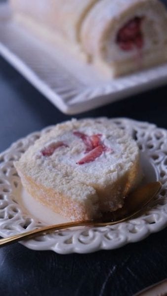 5. להרכבה: פותחים את בצק הרולדה וחותחים מעט שולים שהתקשו מיד לאורך בצורה סימטרית. מורחים על שני שליש מהבצק את ההקצפת ומפזרים על מחצית מהמילוי את התותים. מתחילים לגלגל את הרולדה מהצד הרחב והמרוח במילוי עד שנוצרת הרולדה. מעבירים לצלחת הגשה. מגישים מיד או מעבירים לקירור. נשמר יומיים בקירור.
