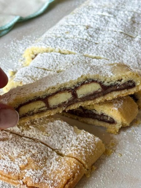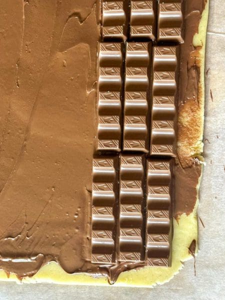 3. מחלקים את הבצק לשתיים ומרדדים כל חלק למלבן בגודל כ 40*20 ס״מ. מורידים את הנייר העליון ומורחים על הבצק ממרח שוקולד בשכבה דקה. בצד הרחב של המלבן מניחים כ 9 אצבעות לאורכו כך שיצרו שכבה צרה של טבליות. בעזרת הנייר מקפלים פעמים את הבצק לגלילה דקה שעוטפת את אצבעות השוקולד.