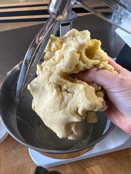 1. מניחים את כל המרכיבים בקערת מיקסר עם וו גיטרה, מפעילים עד שנוצר בצק אחיד.