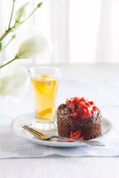עוגת שוקולד חמה מוגשת עם קולי תותים