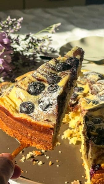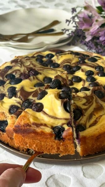 עוגה רכה, נימוחה ויפהפייה, מנוקדת בבצק כהה ומילוי גבינה יציב.