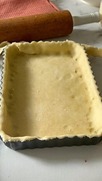 - על משטח מקומח מרדדים מחצית מהבצק לעיגול או מלבן התואם את התבנית ובעובי כ 0.3 מ״מ. מעבירים אותו לבסיס התבנית ומהדקים היטב לבסיס ולדפנות. נועצים מזלג בבסיס התבנית כמה פעמים. מעבירים למקפיא ל 15 דקות לקירור והתייצבות.