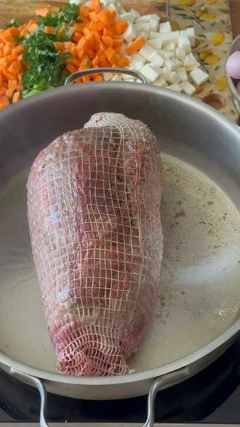 - מחממים שמן זית בסיר גדול או מחבת סוטאז׳. מטגנים את נתח הצלי כ 4-5 דקות על אש גבוהה מכל צד או עד שמזהיב. מוסיפים ירקות שורש ובצל לצידי הסיר ומטגנים כ 5 דקות.