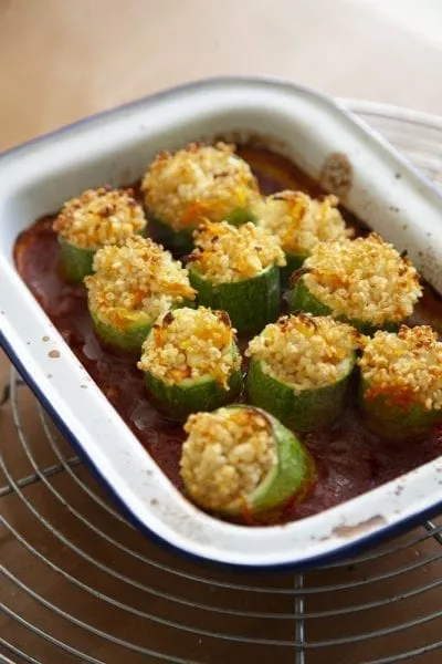 4. ממלאים בכל קישוא כף מהמילוי ומניחים צמודים האחד לשני בתבנית. ממלאים את בסיס התבנית ברוטב. אופים כ 15 דקות מוסה בנייר אלומיניום. מורידים את הנייר וממשיכים לאפות עוד 10-15 דקות בתנור או עד שהקינואה מזהיבה מעט.