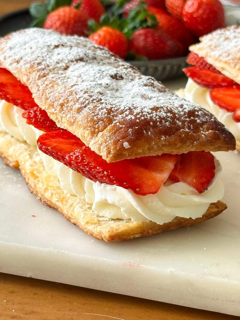 - חוצים כל מלבן לשנים לאורכו. על בסיס הבצק מזלפים קצפת במעגלים ובגובה של כ 3 ס״מ. מסדרים מעל תותים ומניחים את מכסה הבצק. מפזרים אבקת סוכר ומגישים.